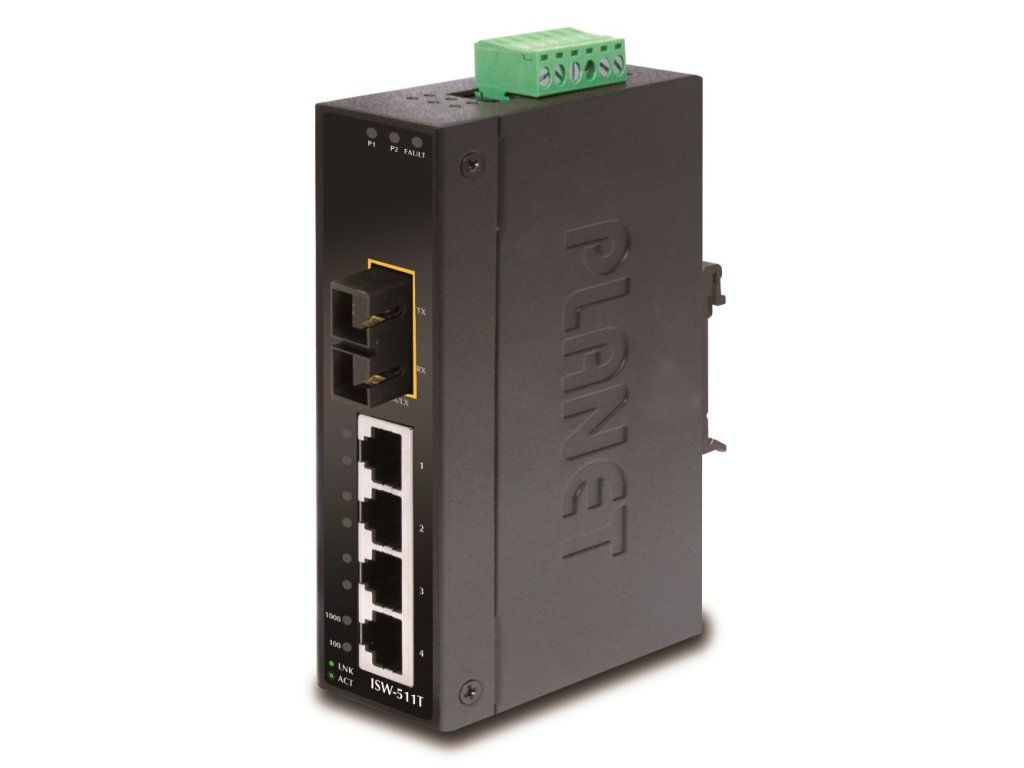 PLANET ISW-511T5portový přepínač a konvertor pro průmyslové aplikace. 4 porty 10/100Base-TX, 1 optický port 100Base-FX, SC konektory, multimode, 1300nm, dosah 2km.