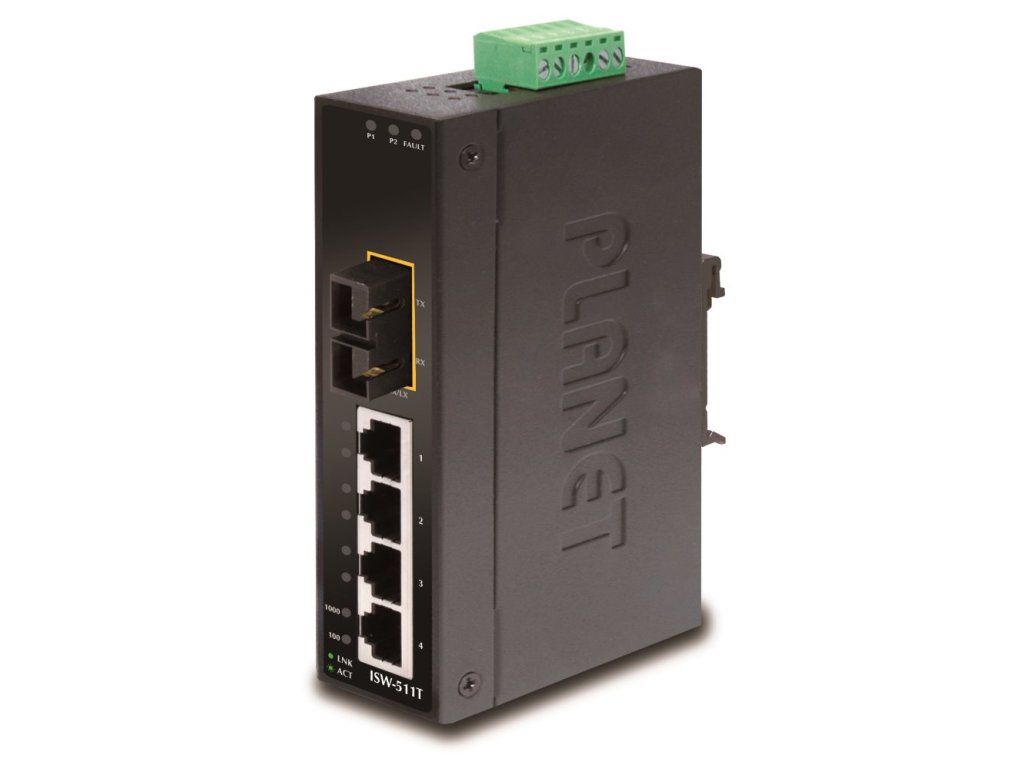 PLANET ISW-511TS155portový přepínač a konvertor pro průmyslové aplikace. 4 porty 10/100Base-TX, 1 optický port 100Base-FX, SC konektory, singlemode, dosah 15km.