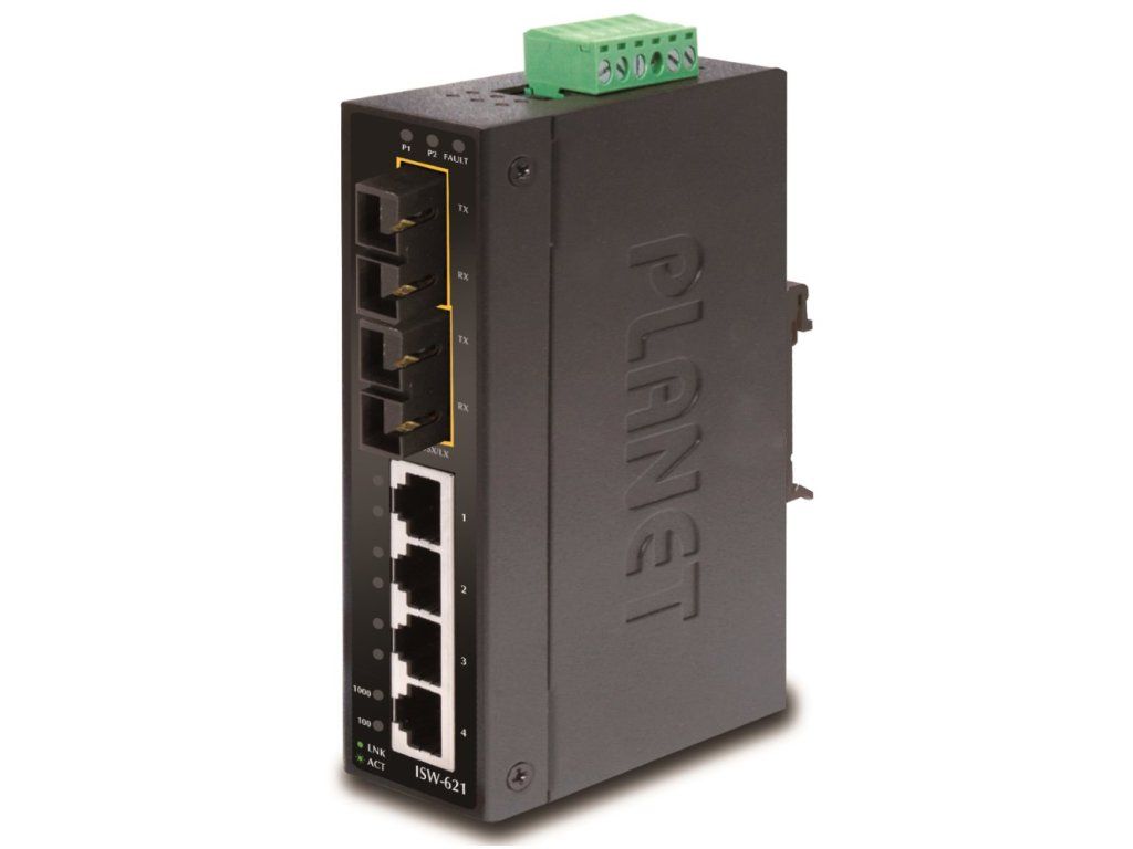 PLANET ISW-621S156portový přepínač a konvertor pro průmyslové aplikace. 4 porty 10/100Base-TX, 2 optické porty 100Base-FX, SC konektory, singlemode, dosah 15km.
