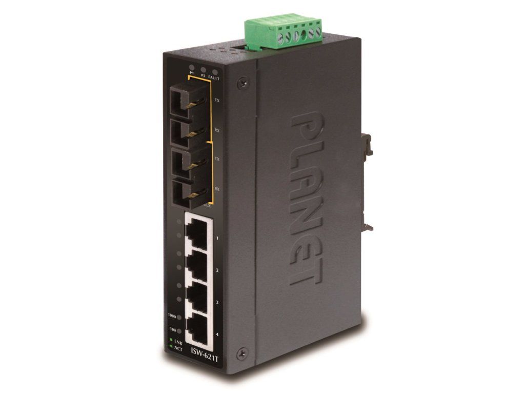 PLANET ISW-621T6portový přepínač a konvertor pro průmyslové aplikace. 4 porty 10/100Base-TX, 2 optické port 100Base-FX, SC konektory, multimode, 1300nm, dosah 2km.