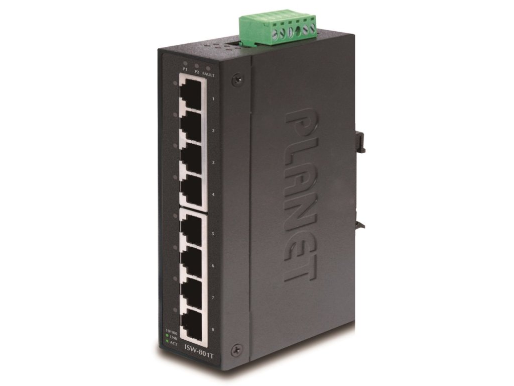 Planet ISW-801T, 8x 10/100, DIN,IP30, rozšířený teplotní rozsah -40~75°C, IEEE 802.3az (EEE), EFT+ESD