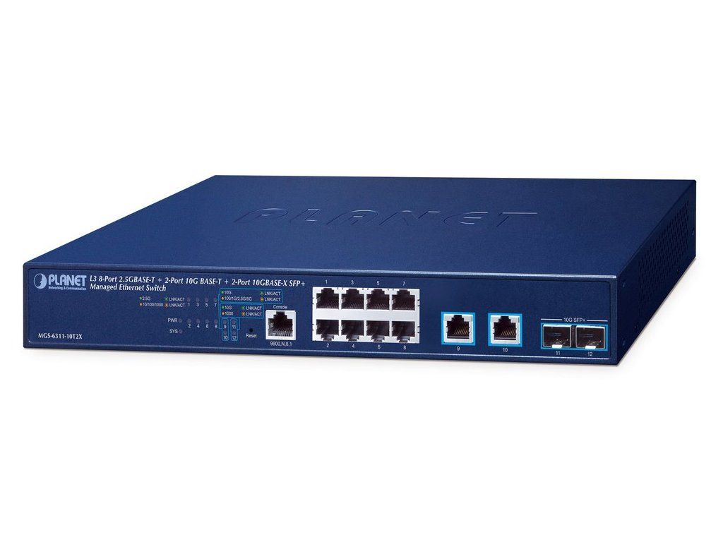 PLANET MGS-6311-10T2XSpravovatelný multigigabitový L3 přepínač, 8× 10/100/1000/2500 Base-T RJ-45, 2× 10G RJ-45, 2× 10G Base-SR/LR SFP+ (zpětně kompatibilní s 1000BASE-SX/LX/BX).