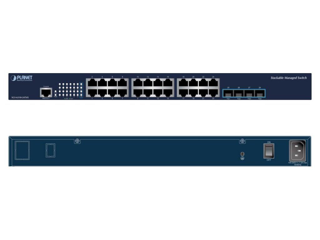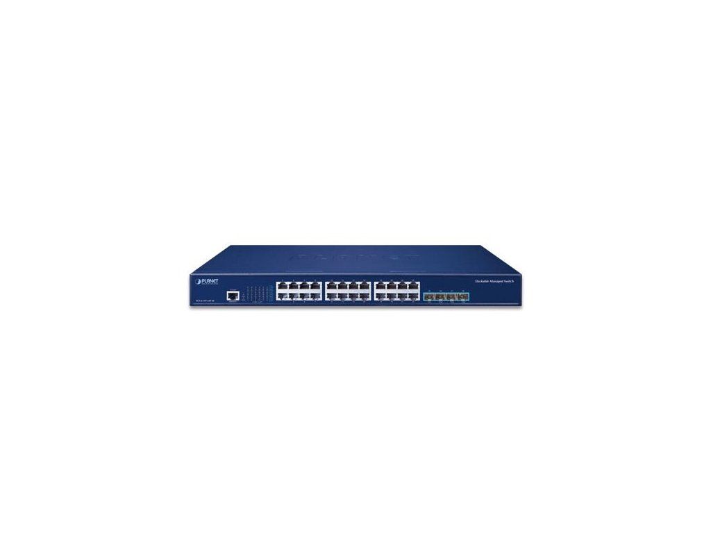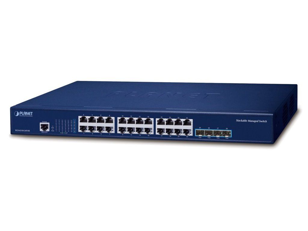 PLANET SGS-6310-24T4XStohovatelný řízený L3 switch, 24x RJ-45 10/100/1000 Base-T, 4x 10G SFP+ Base-SR/LR, 1x RJ-45 (RS-232) konzolový port.