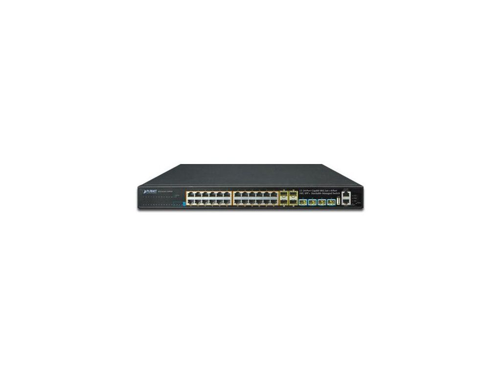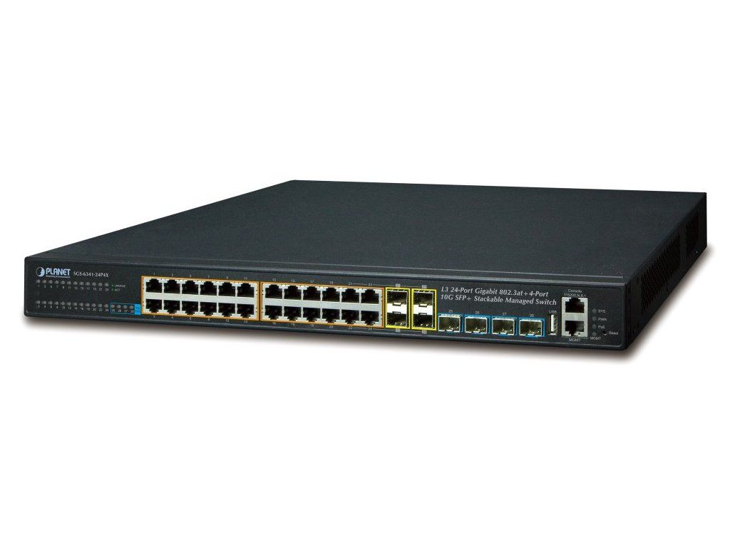 PLANET SGS-6341-24P4XStohovatelný řízený L3 PoE switch, 24x 1000 Base-T, 4x SFP 100/1000 Base-X combo port, 4x 10G Base SFP+, PoE injektory 802.3at do 370 W.