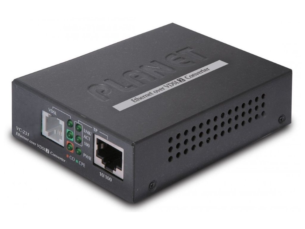 PLANET VC-231Ethernet po telefonním vedení (technologie VDSL2). 1× LAN RJ-45, 1× VDSL2 RJ-11 konektor. 100/100 Mbps na 300 m. Napájení DC 5 V/ 2 A (zdroj je součástí balení).