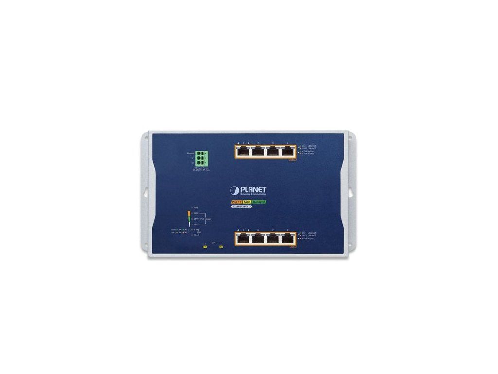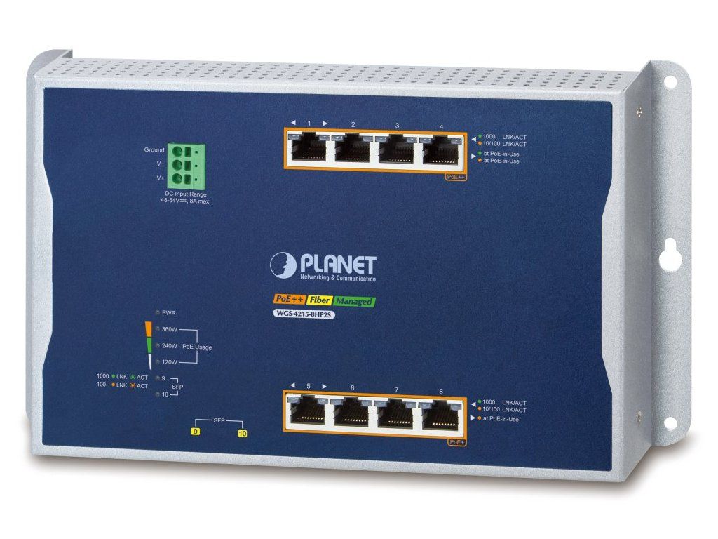 Planet WGS-4215-8HP2S plochý L4 switch, 8x1Gb, 2x1Gb SFP, 4+4 PoE 802.3at/bt 360W, 48-56VDC, -40~75°C, IP30, fanless