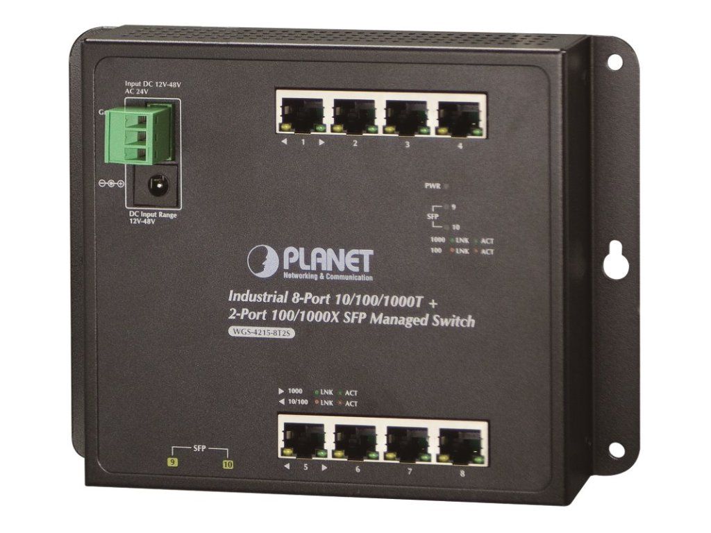 Planet WGS-4215-8T2S plochý L4 switch, 8x1Gb, 2x1Gb SFP, 12-48VDC/24VAC, -40~75°C, IP30, fanless