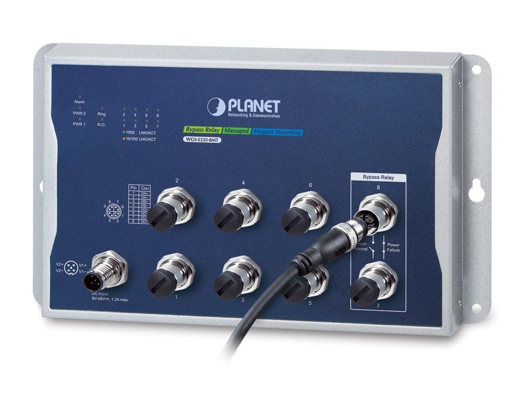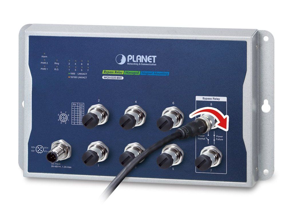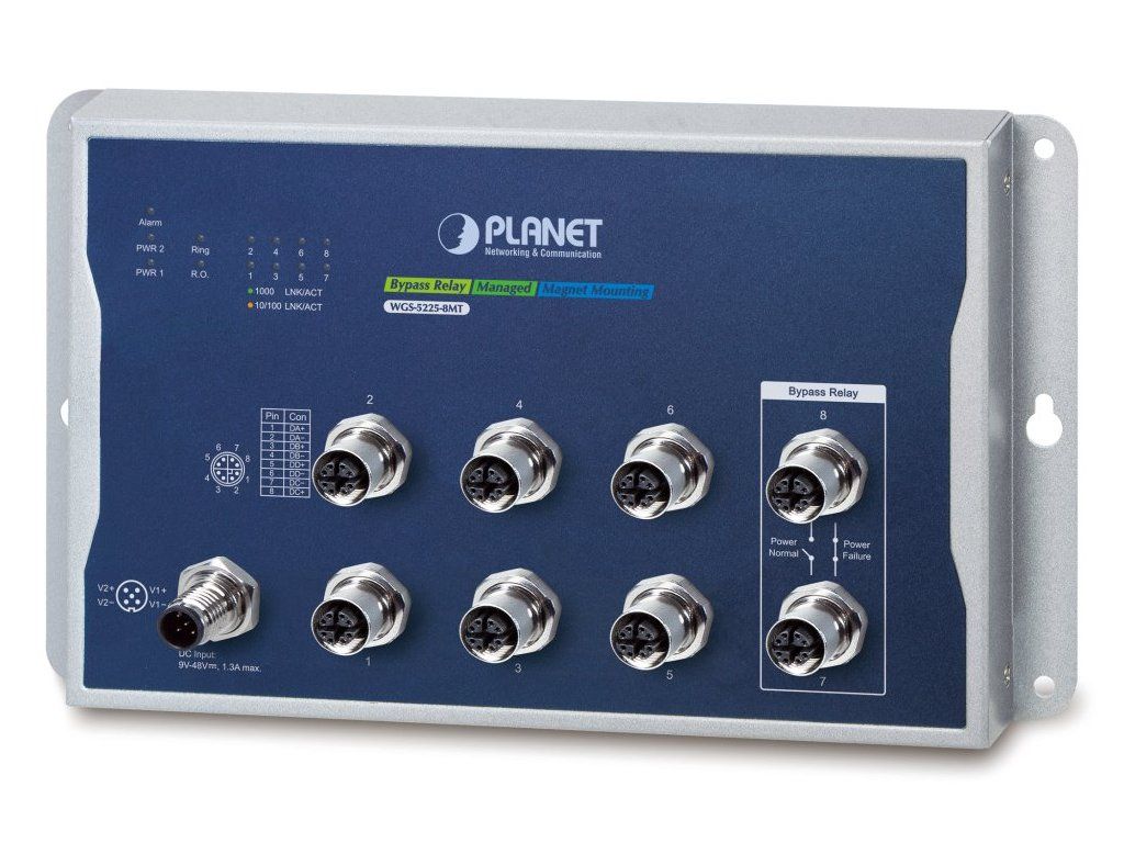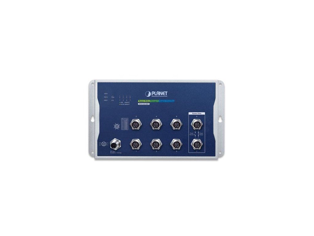 PLANET WGS-5225-8MTAdministrovatelný průmyslový M12 switch s pokročilým L2+/L4 přepínáním a zabezpečením + L3 software VLAN statickým routováním (IPv4 a IPv6) a podporou Bypass režimu (1 pár).