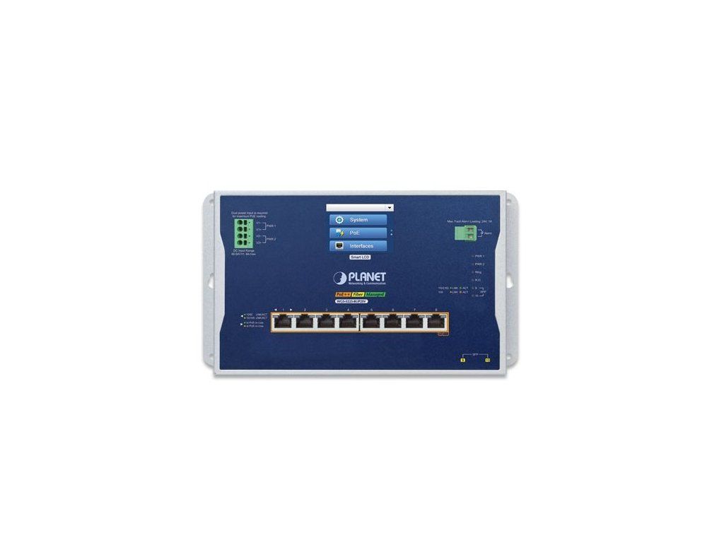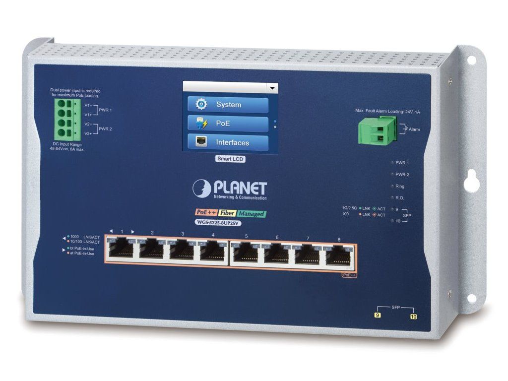 Planet WGS-5225-8UP2SV plochý L3 switch, 8x1Gb, 2x2.5Gb SFP, PoE 95/720W, 48-54VDC, -20~70°C, IP30, fanless, touch LCD