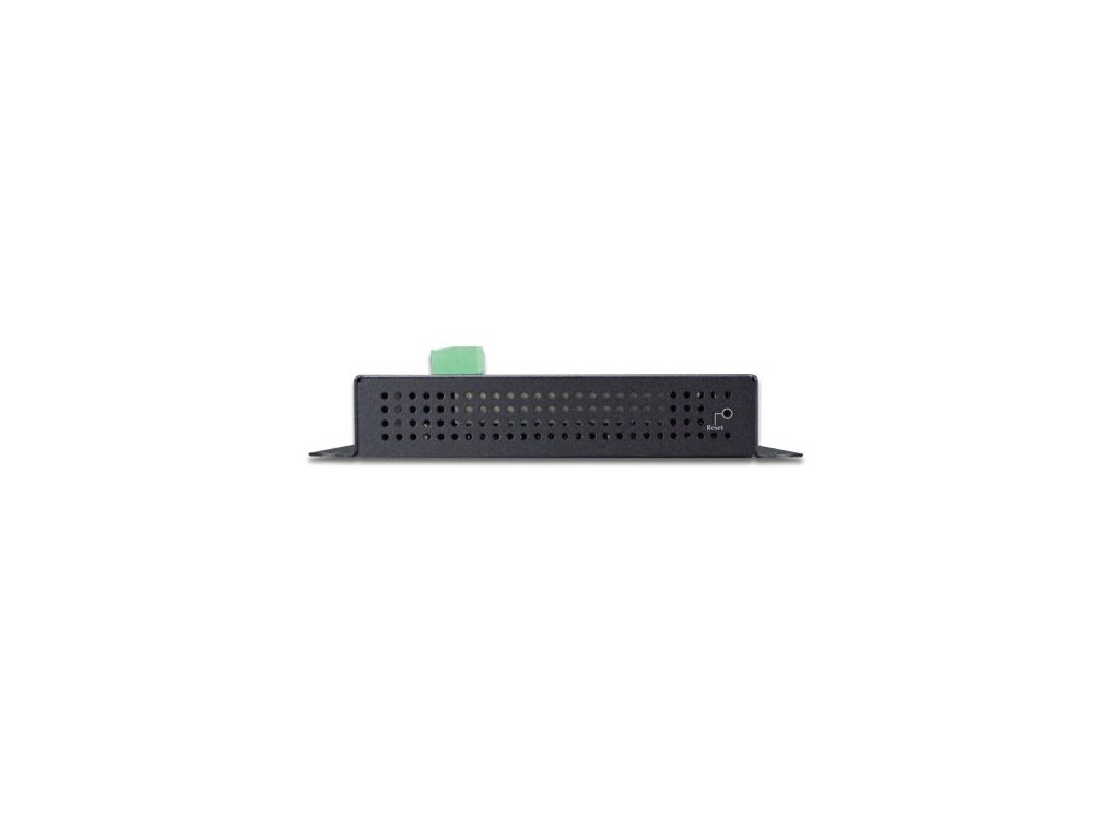Instalace na zeď nebo na DIN, kovové provedení IP30, odolný vůči pádu a vibracím. ESD ochrany portů, napájení DC 48~56V, provoz při -40 až 75°C, bez ventilátorů.