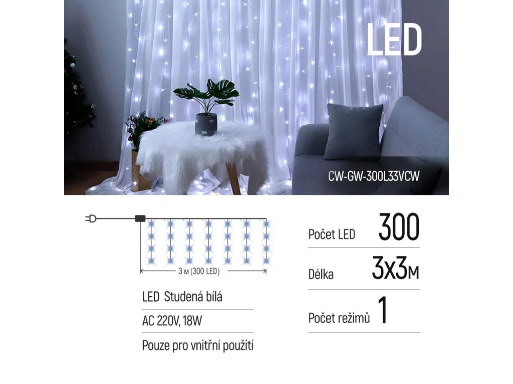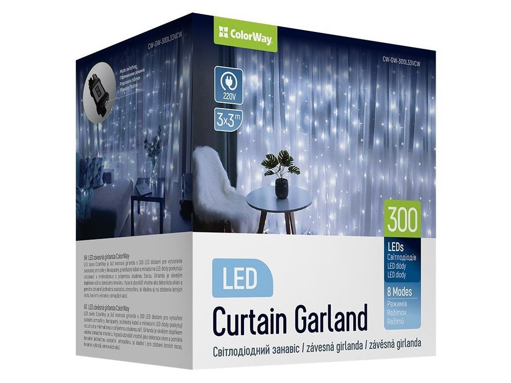 ColorWay CW-GW-300L33VCWLED závěs ColorWay je 3× 3metrová girlanda s 300 LED diodami pro vytvoření sváteční atmosféry. Nenápadný, průhledný kabel a miniaturní LED diody poskytují vzdušnost a minimalismus s příjemnou studeně bílou září. Girlanda je skvělým doplňkem vašeho domácího interiéru. Vypadá obzvlášť vhodně jako dekorace oken a pomáhá dotvářet jedinečnou sváteční atmosféru. Je ideální i pro zdobení letních teras, kaváren, výkladů a venkovních akcí.