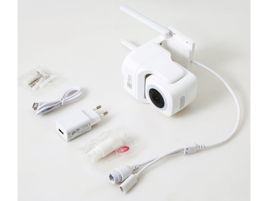 Chytrá venkovní bezpečnostní kamera s detekcí pohybu disponuje otočným mechanismem pro monitorování v zorném úhlu 360°. Snímač nabízí rozlišení 4 Mpx a je schopný snímat video v rozlišení 2560 × 1440 bodů. Pro případ zhoršených světelných podmínek je přítomen IR přísvit do vzdálenosti až 5 m a bílý LED přísvit pro barevné záznamy v noci. Součástí kamery je integrovaný reproduktor a mikrofon, který umožní kvalitní oboustrannou komunikaci. Připojení lze jednoduše realizovat jak bezdrátově skrze Wi-Fi, tak drátově pomocí RJ-45. Propojení kamery pomocí aplikace v mobilním zařízení umožní pohodlný vzdálený přístup, ovládání kamery, pořizování záznamů či fotografií. Natočené záznamy je možné ukládat i na microSD kartu do kapacity až 128 GB. Je také kompatibilní s inteligentními hlasovými asistenty Amazon Alexa, Google Assistant a Apple Siri a standardy ONVIF a WebRTC.
