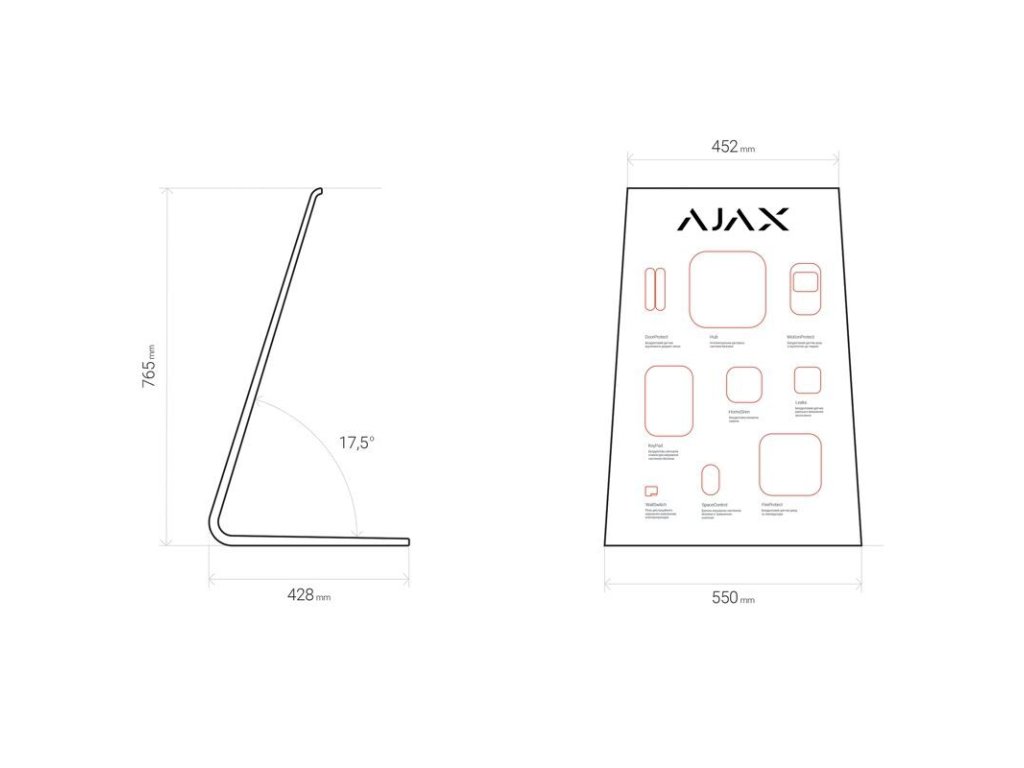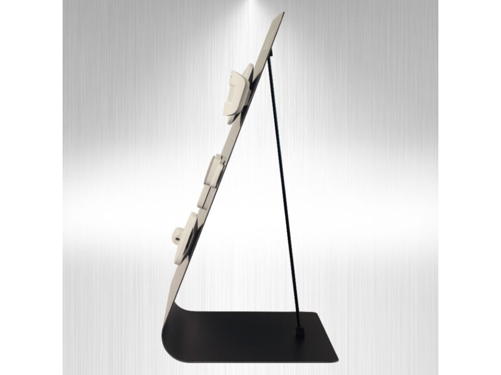 Prezentační stojan ve tvaru L, o rozměrech 550 x 765 x 428 mm,