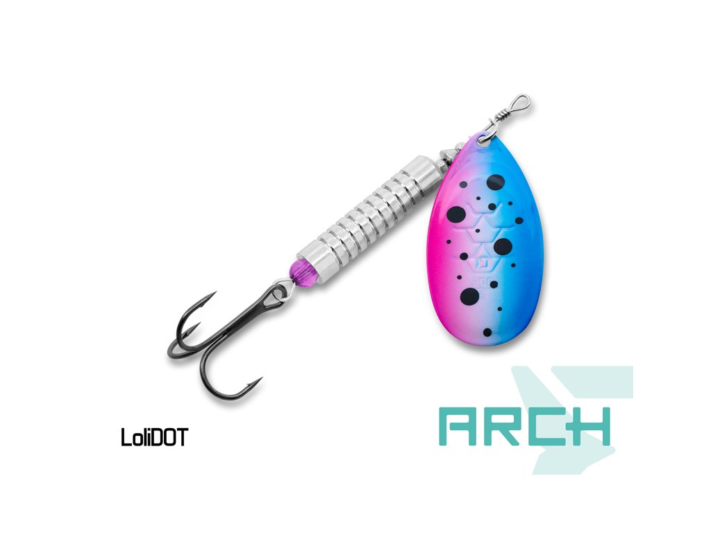 Je ideální nástrahou pro lov širokého spektra dravých ryb. Kvalitní zpracování, dráždivý pohyb a intenzivní vibrace nenechají v klidu žádného dravce. Model ARCH se vyznačuje kulatým listem ideálním pro použití na stojatých vodách. Precizně vyvážené tělo a lehce rotující list umožňuje dokonalý pohyb rotačky i při pomalém vedení nástrahy. Nástraha je opatřena kvalitním trojháčkem pro dokonalý zásek a dobře drží během souboje s bojovnými rybami. Designové provedení modelu Delphin ARCH představuje klíčový faktor úspěchu a je tvořeno léty ověřenými barevnými kombinacemi, které jsou nanášeny pomocí UV aktivních barev. Podstata UV složky se projevuje zejména v hlubších partiích nebo v přikalené vodě po deštích, kdy je viditelnost značně snížena. Zatímco běžné barevné spektrum se s přibývající hloubkou ztrácí, UV pigmenty odrážejí zbytkové světlo a nástraha se pro dravce doslova rozsvítí. Metalické provedení efektivně odráží sluneční světlo a silnými odlesky láká dravce ze širokého okolí. Díky různým velikostním provedením dokážete přesně zacílit na konkrétní druh ryby – menší velikosti jsou vhodné na lov pstruhů, jelců či okounů, střední velikosti zase na lov bolenů či candátů a ty největší vám pomohou zacílit na velké predátory jako jsou štiky či hlavatky.Doplňkové parametry