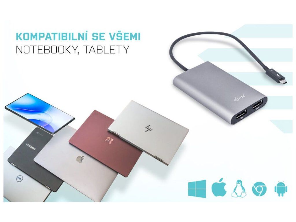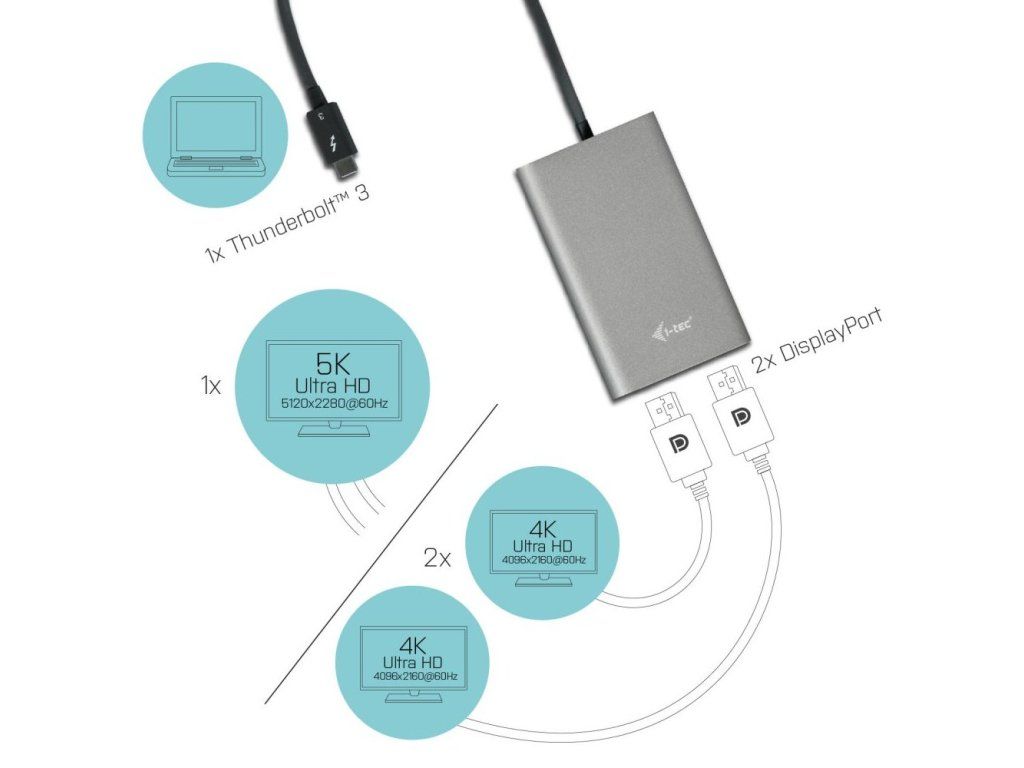 I-TEC Thunderbolt 3 na dual DisplayPortAdaptér I-TEC Thunderbolt na dual DisplayPort umožňuje rozšíření vaší pracovní plochy o dva externí DisplayPort monitory přes Thunderbolt 3 konektor. Adaptér podporuje přenos 5K rozlišení až 5120 × 2880 pixelů nebo 2 x 4K rozlišení 4096 × 2160 včetně audio signálu při využití obou konektorů DisplayPort. Díky němu si můžete užívat filmů na domácím projektoru, udělat ze stolního počítače rozšířenou pracovní stanici nebo ve škole či v práci představovat prezentace.