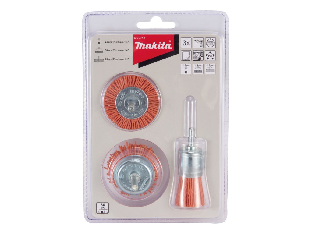 Sada obsahuje 3 nylonové kartáče s hrubostí 80. Průměr hřídele 6 mm. Ideální pro hrubé broušení dřeva, plastu nebo kovu při použití vrtacích šroubováků a vrtaček.Doplňkové parametry