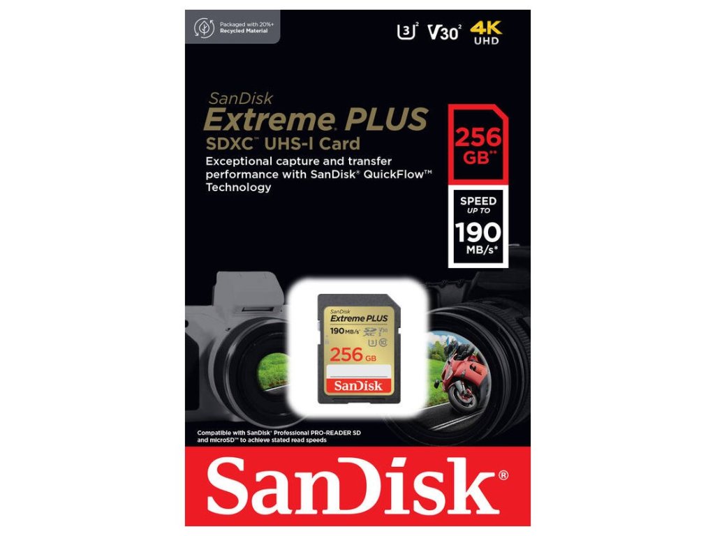 SanDisk Extreme PLUS 256GB SDXC / UHS-I, Class 10, U3, V30 / up to 190MB/s & 130MB/s Read/Write / + 2 years RescuePRO
