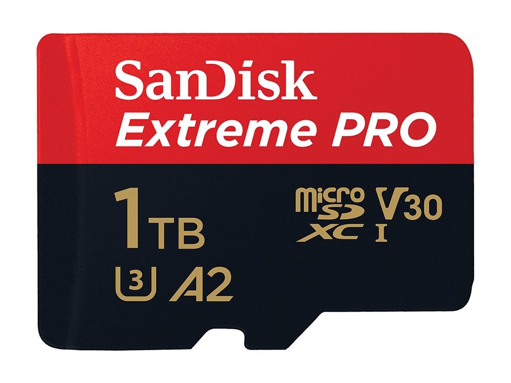 SanDisk Extreme Pro microSDXC 1 TB + adaptérPaměťová karta formátu micro SDXC nabízí kapacitu 1 TB. Rychlost čtení je až 170 MB/s a rychlost zápisu až 90 MB/s. Součástí balení je SD adaptér.