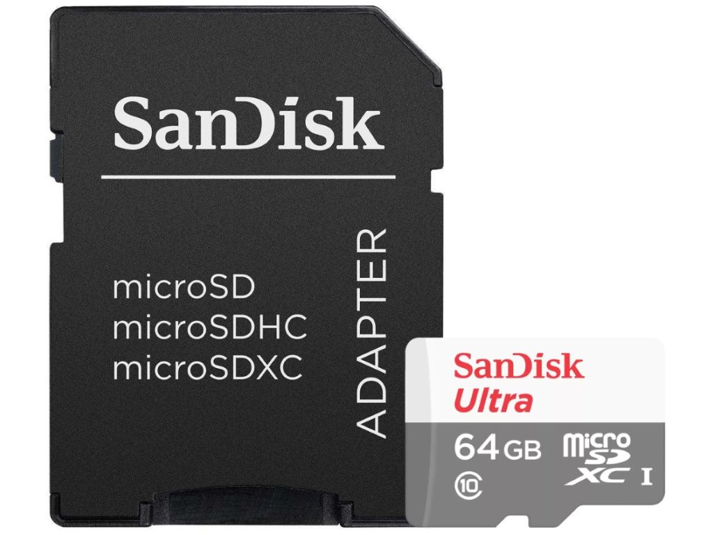 SanDisk Ultra microSDXC 64 GB + adaptérPaměťová karta formátu micro SDXC nabízí kapacitu 64 GB. Rychlost čtení je až 100 MB/s a rychlost zápisu až MB/s. Součástí balení je SD adaptér.