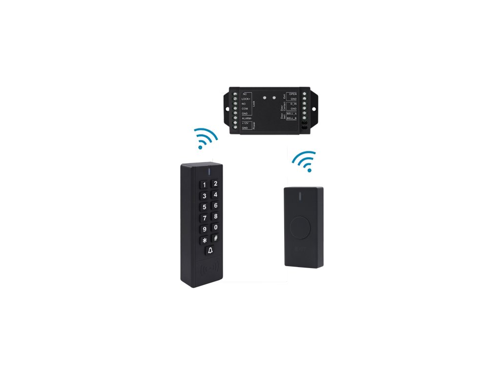 Autonomní venkovní bezdrátová klávesnice a čtečka ID karet EM 125kHz, bezdrátové odchodové tlačítko, bezdrátová komunikace mezi čtečkou a přístupovou bezdrátovou ústřednou, relé výstup, dosah až 50m, napájení čtečky 3x AAA, krytí IP65, rozsah teploty -20°C~+60°C, rozměry v134 x š38 x h25mm.