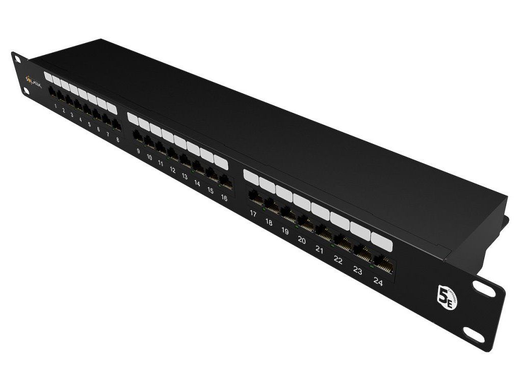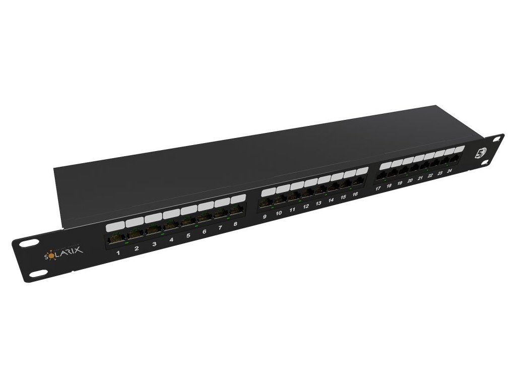 Patch panel Solarix SX24-5E-STP-BK-N je panel osazený 24 porty RJ-45, jehož součástí je vyvazovací lišta sloužící k přehlednému vyvázání a pevnému uchycení kabelů přímo k tělu panelu. Instalační kabel se zakončuje do duální IDC svorkovnice typu 110/Krone. Svorkovnice je z důvodu snadného zakončení kabelu označena podle standardu T568A i T568B. Stejně jako všechny ostatní komponenty strukturované kabeláže Solarix je tento panel vyroben tak, aby zaručoval maximální životnost, velmi dobrou funkčnost a vysokou spolehlivost.
