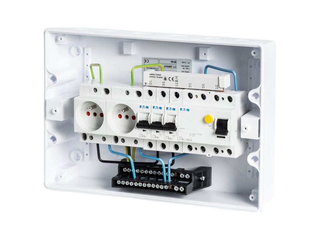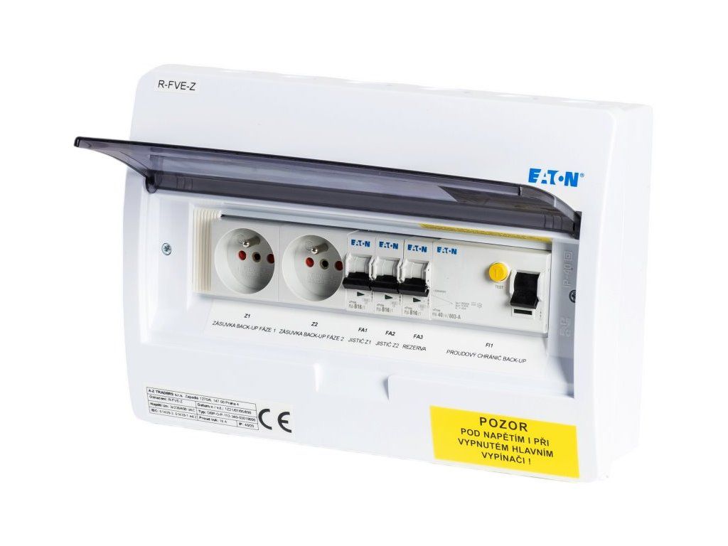V rozvaděči je osazen jistič B16/1 pro jištění dvou zásuvek a jedné rezervy pro samostatný spotřebič ze zálohy střídače a proudový chránič typu A.