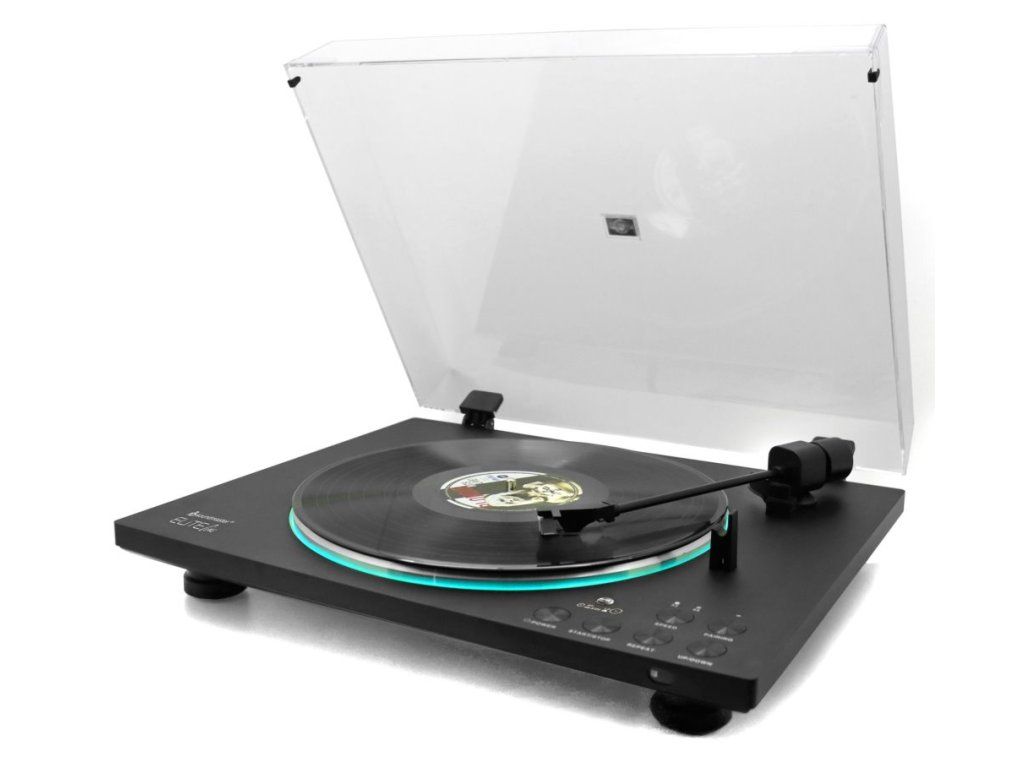 Dálkové ovládání umožňuje pohodlné ovládání funkcí jako přeskakování vpřed a vzad, přehrávání/pauza, změna osvětlení, zdvih ramene a opakování. Gramofon je vybaven vestavěným PHONO předzesilovačem a RCA (cinch) linkovým výstupem pro snadné připojení k audio systému. Funkce Bluetooth® vysílání umožňuje bezdrátový přenos zvuku na kompatibilní zařízení.