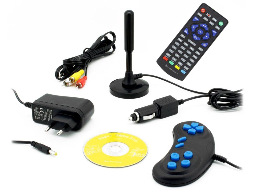 Součástí balení je dálkový ovládač, napájecí adaptér, nabíječka do auta, DVB-T2 anténa, AV kabel, obal, herní disk a herní ovladač.
