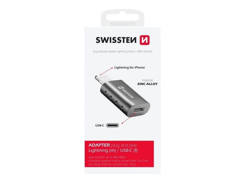 SWISSTEN OTG adaptér USB-C na LightningMiniaturní OTG adaptér umožňuje připojit zařízení s konektorem USB-C do Lightning. Podporuje datové přenosy až do rychlosti 480 Mb/s. V případě nabíjení podporuje nabíjecí proud až 2,4 A a napětí až 5 V. Kryt adaptéru je vyroben z odolného materiálu na bázi zinku.
