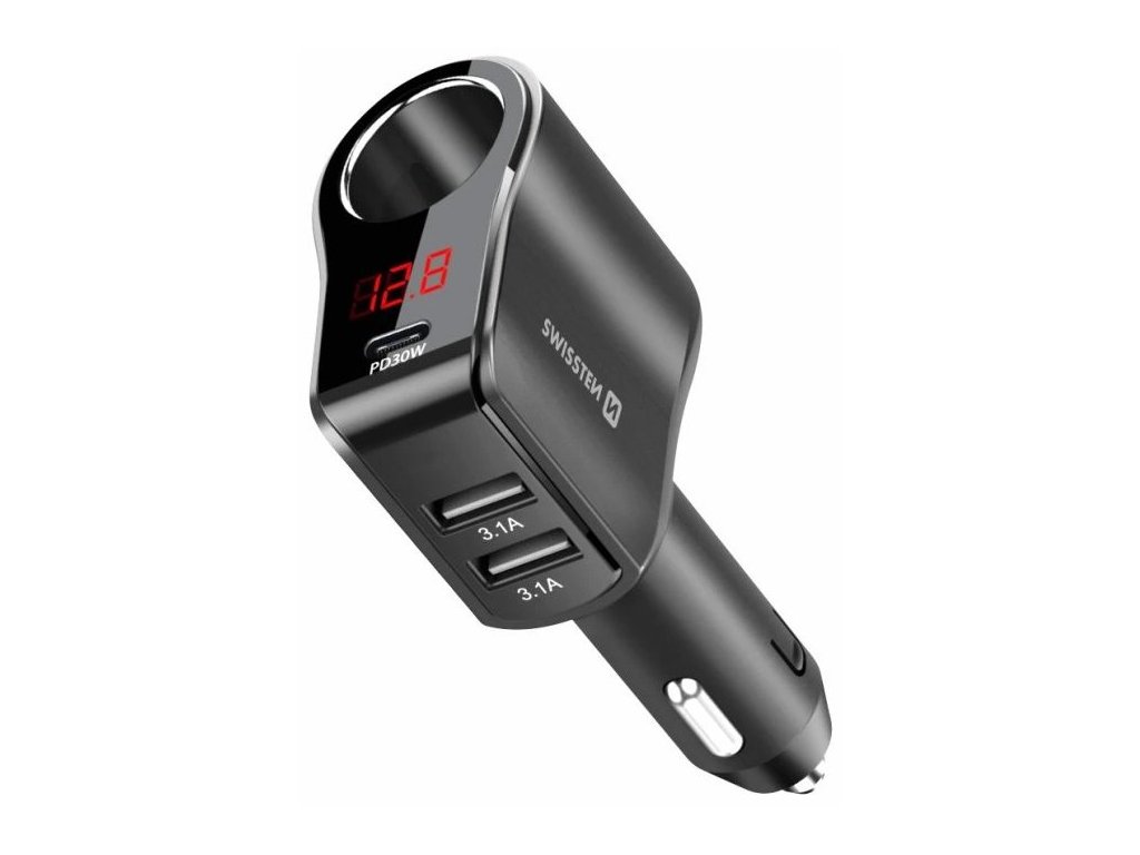 SWISSTEN 20114020Kvalitně zpracovaná nabíječka do auta s výstupem USB-C, dvěma USB, podporou Power Delivery a výkonem 30 W. Na cestách spolehlivě nabije jakýkoli mobilní telefon nebo tablet. K dispozici je také 1× CL výstup s výkonem 108–216 W, který slouží k připojení např. autolednice či autokamery. Vestavěný LED displej pak zobrazuje úroveň napětí autobaterie.