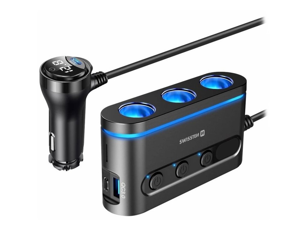 SWISSTEN 20114010Kvalitně zpracovaná nabíječka do auta s výstupem USB, dvěma USB-C, podporou Power Delivery, Quick Charge 3.0 a výkonem 30 W. K dispozici jsou také tři CL výstupy s výkonem 108–216 W, které slouží k připojení autolednice či autokamery. Jednotlivé CL výstupy jsou vybaveny tlačítky pro vypnutí/zapnutí.