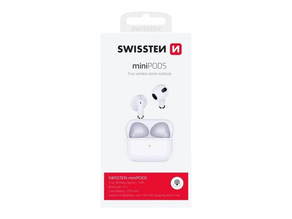 SWISSTEN MINIPODSBezdrátová sluchátka s mikrofonem založená na technologii Bluetooth 5.1. Disponují měkkými silikonovými špunty do uší pro kvalitní zvuk a pohodlí i při každodenním poslechu. Samozřejmostí je možnost ovládání hudby, včetně funkce Stop/Play, ovládání hlasitosti a posun na předchozí nebo následující skladbu. Při plném nabití vydrží headset až 4 hodiny provozu a s nabíjecím pouzdrem pak až 12 hodin provozu.