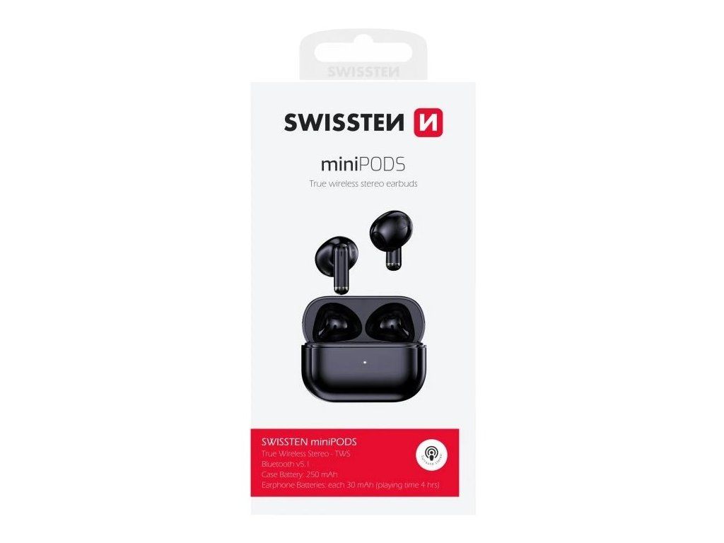 SWISSTEN MINIPODSBezdrátová sluchátka s mikrofonem založená na technologii Bluetooth 5.1. Disponují měkkými silikonovými špunty do uší pro kvalitní zvuk a pohodlí i při každodenním poslechu. Samozřejmostí je možnost ovládání hudby, včetně funkce Stop/Play, ovládání hlasitosti a posun na předchozí nebo následující skladbu. Při plném nabití vydrží headset až 4 hodiny provozu a s nabíjecím pouzdrem pak až 12 hodin provozu.