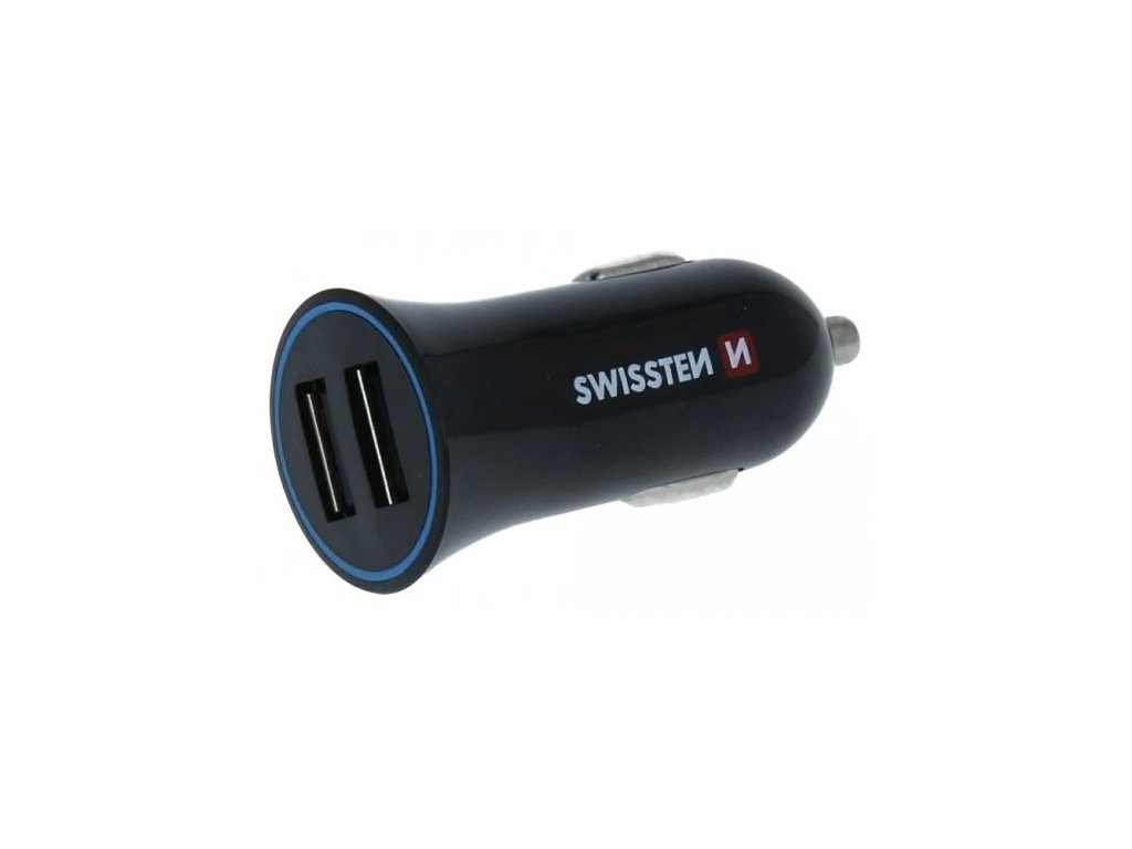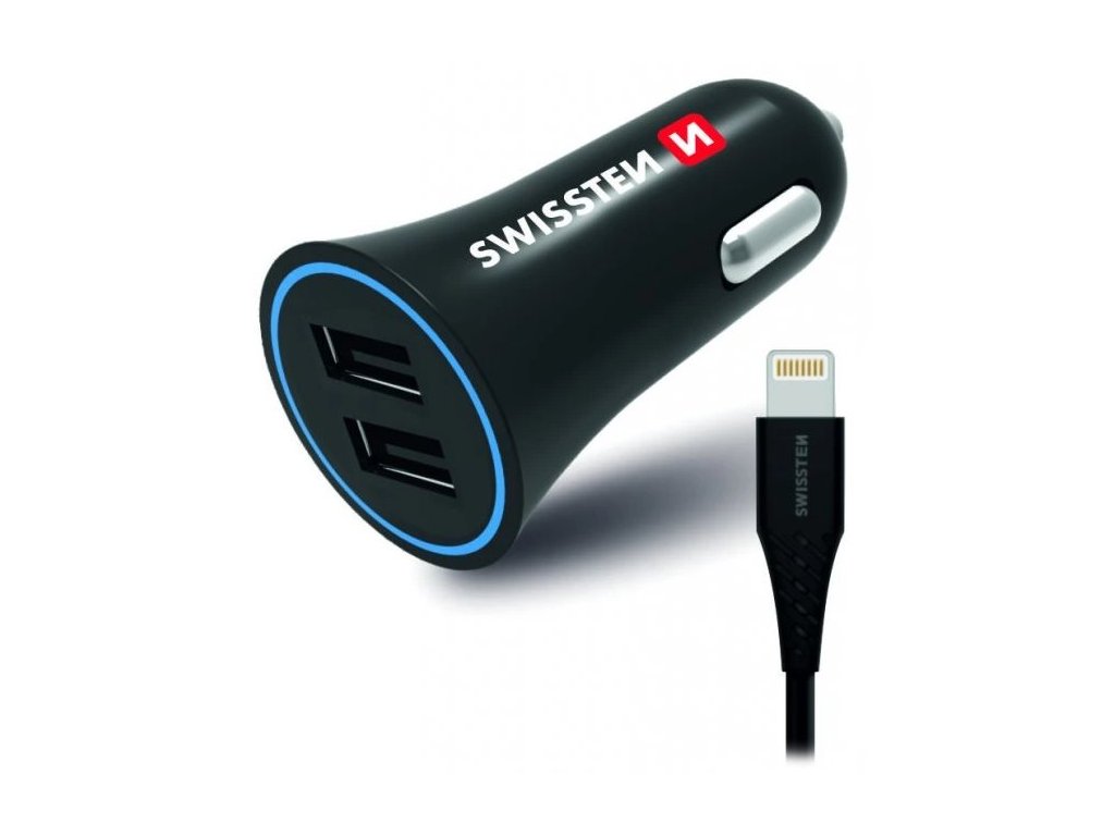 SWISSTEN napájecí adaptér 2× USB + Lightning kabelPraktická autonabíječka do zapalovače, se kterou lze nabíjet až dvě zařízení najednou pomocí dvou USB portů. V případě nabíjení pouze jednoho zařízení je maximální výstupní proud 2,4 A. Budete-li nabíjet dvě zařízení současně, výstupní proud se rozdělí na 1,2 a 1,2 A pro každé zařízení.