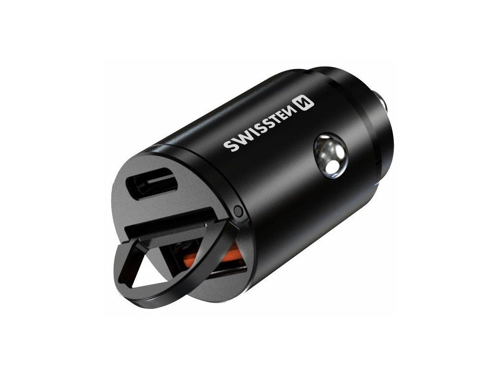 SWISSTEN 20111770Miniaturní nabíječka do auta s výstupem USB-C a USB s výkonem až 30 W, která na cestách spolehlivě nabije jakýkoli mobilní telefon nebo tablet. Zajisté potěší podpora technologií PowerDelivery a SuperCharge 3.0.
