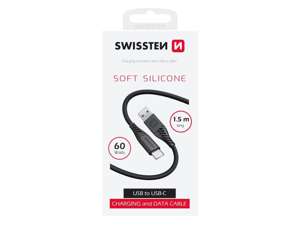 SWISSTEN SOFT SILICONE USB na USB-C 1,5 mDatový a nabíjecí USB na USB-C kabel podporuje kromě přenosu dat rychlostí 480 Mb/s také nabíjení proudem až 3 A a lze ho využít i pro technologii rychlého dobíjení s výkonem až 60 W. Kabel je vyroben z měkkého silikonu, díky tomu je flexibilní za všech podmínek a má vysokou odolnost proti ohybu.