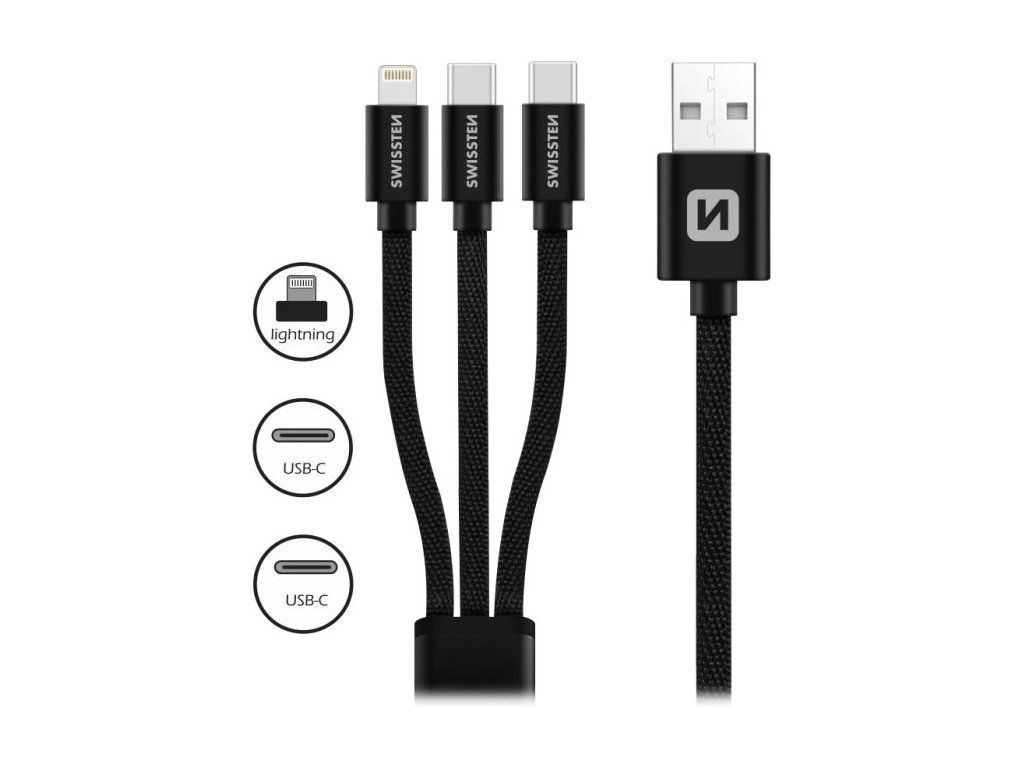 Swissten datový kabel textile 3in1 1,2 m černý (lightning, 2x usb-c)