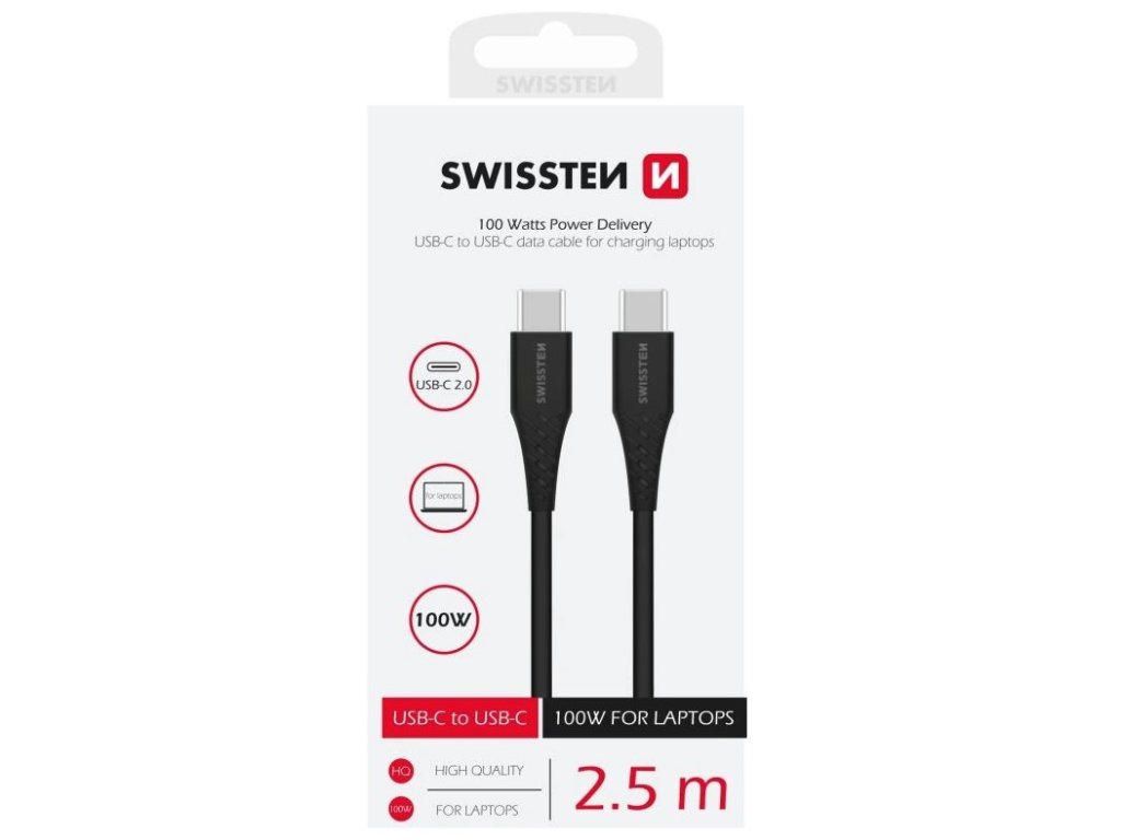 SWISSTEN USB-C na USB-C 2,5 mUSB-C kabel vyrobený z termoplastického elastomeru (TPE) podporuje kromě přenosu dat také nabíjení proudem až 5 A (Power Delivery 100 W). Je vhodný pro rychlé nabíjení notebooku či MacBooku.