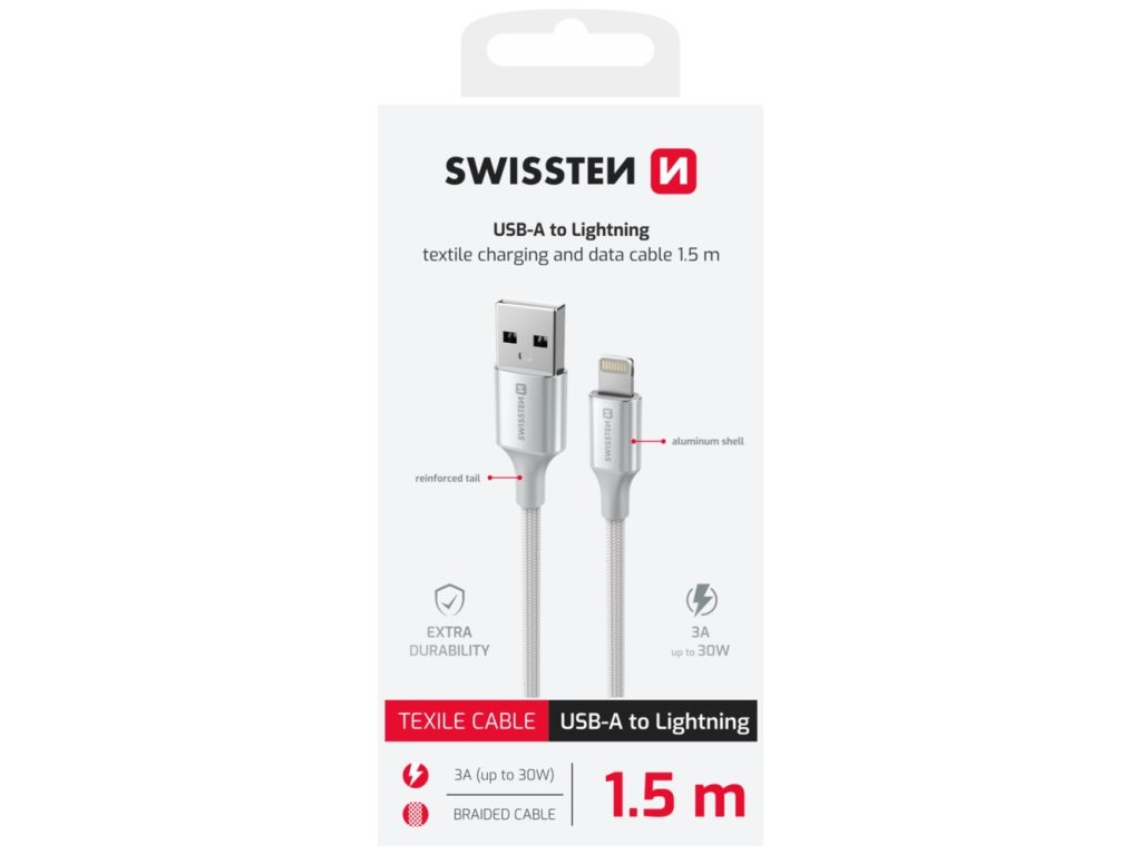 SWISSTEN TEXTILE II USB na Lightning 1,5 mKabel s kvalitním textilním opletením vhodný pro připojení zařízení s konektorem Apple Lightning k počítači s konektorem USB. Podporuje nabíjení proudem až 3 A. Rychlost datového přenosu je až 480 Mb/s.