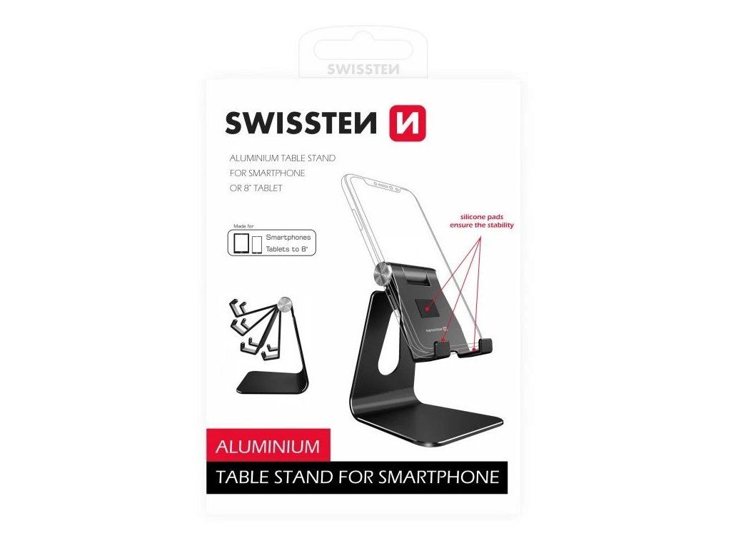 SWISSTEN hliníkový stojánek na telefonStojánek na telefon či tablet do 8" z elegantního broušeného hliníku je vhodný jak na pracovní stůl, tak třeba na noční stolek. Svým vzhledem vhodně doplní design každé místnosti, a zároveň poskytne vašemu chytrému telefonu stabilní zajištění proti pádu a poškození. Vybaven je čtyřmi protiskluzovými podložkami na spodní straně a dalšími ochrannými silikonovými plochami přímo na těle stojánku, kde slouží jako ochrana proti poškrábání telefonu. Celý stojánek lze díky kloubu jednoduše složit. Středový kloub umožňuje také libovolné natočení stojánku do preferovaného úhlu.