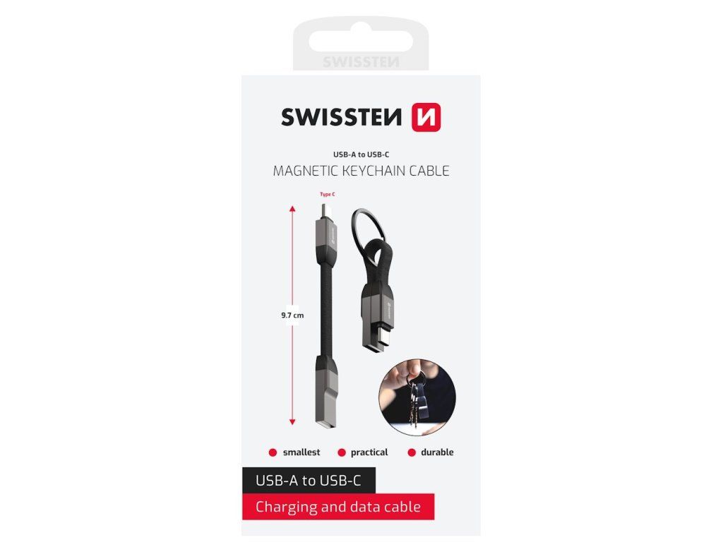 SWISSTEN KEYCHAIN USB na USB-C 9,7 cmMagnetický USB na USB-C kabel měřící pouhých 9,7 cm je ideálním doplňkem pro každodenní použití. Kompaktní design a zabudované magnety umožňují snadné připevnění kabelu na klíče, kde vytvoří stylovou smyčku. Odolný textilní materiál a hliníkové koncovky zajistí dlouhou životnost a ochranu před opotřebením. Kabel podporuje kromě přenosu dat rychlostí 480 Mb/s také nabíjení výkonem až 15 W (DC 5V/3A).