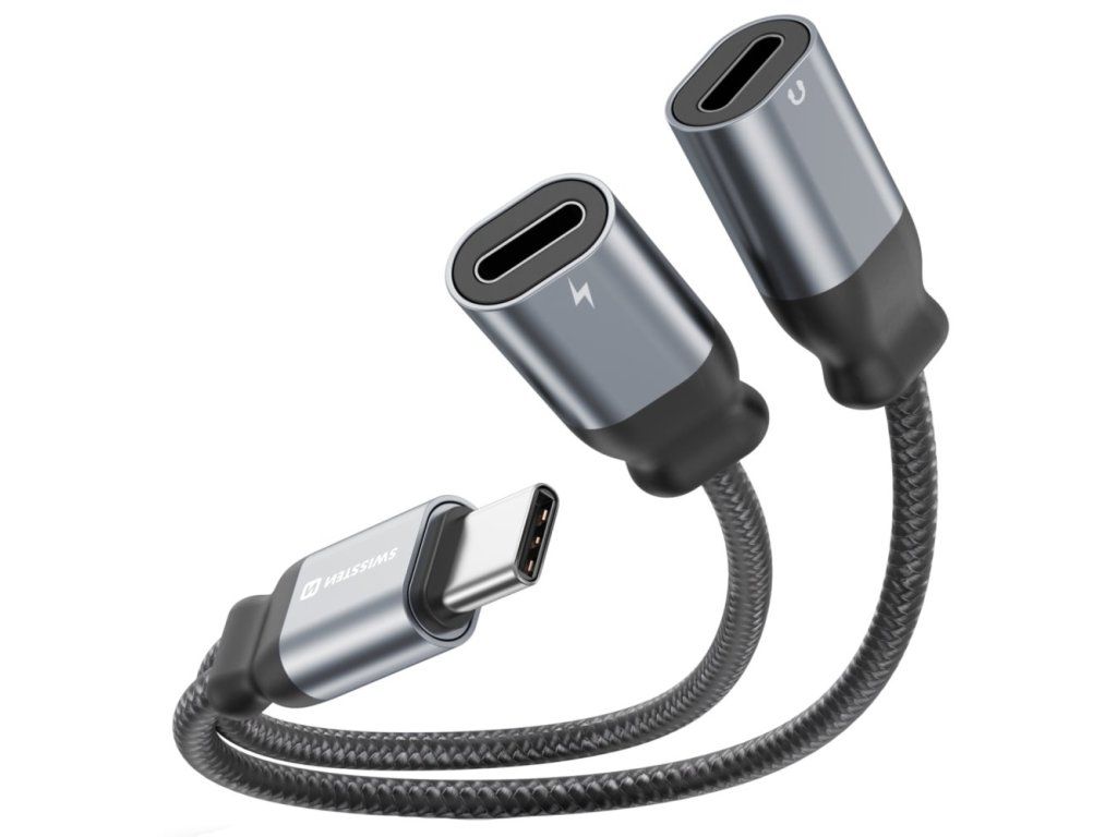 Swissten nabíjecí audio adaptértextile usb-c (samec) / 2x usb-c (samice) 0,12 m černý