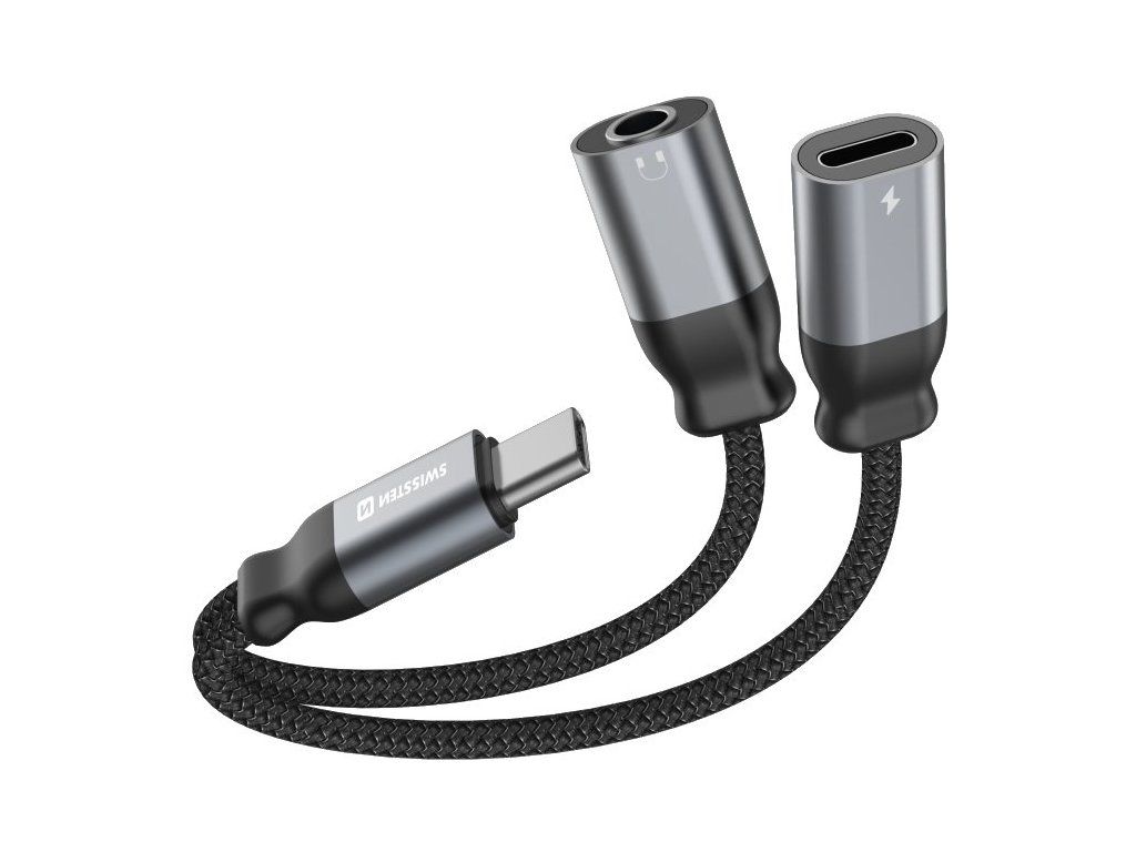 SWISSTEN TEXTILE USB-C na USB-C + 3,5mm jack 12 cmRedukce s konektory USB-C (M), USB-C (F) a 3,5 mm jack (F), díky které můžete nabíjet váš smartphone či tablet a zároveň poslouchat hudbu skrze připojená sluchátka. Je vybavena kvalitním textilním opletem, který zajišťuje vyšší odolnost proti poškození a zamotání.