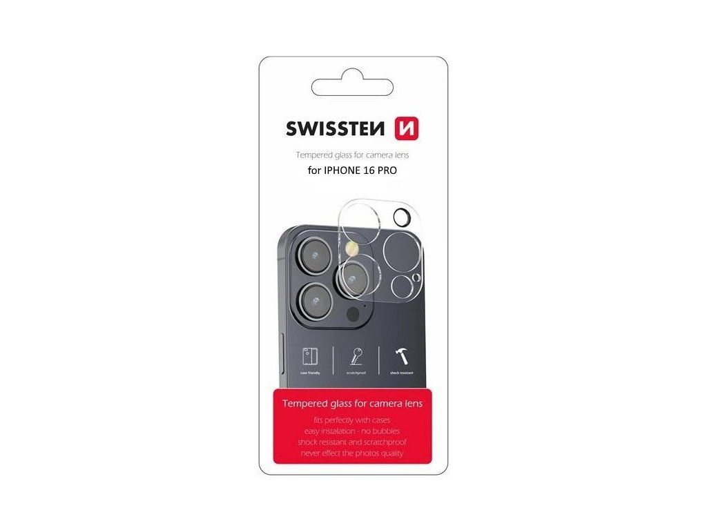 SWISSTEN ochranné sklo na čočky fotoaparátu pro Apple iPhone 16 ProTvrzené ochranné sklo pro ochranu čoček fotoaparátu mobilního telefonu Apple iPhone 16 Pro. Sklo pokryje kompletně celý povrch fotoaparátů včetně svítilny, a díky extrémní tvrdosti třídy 9H je tak chrání před poškrábáním, prachem a nečistotami. Jelikož je transparentní, nijak neovlivňuje kvalitu fotek ani při focení bleskem.
