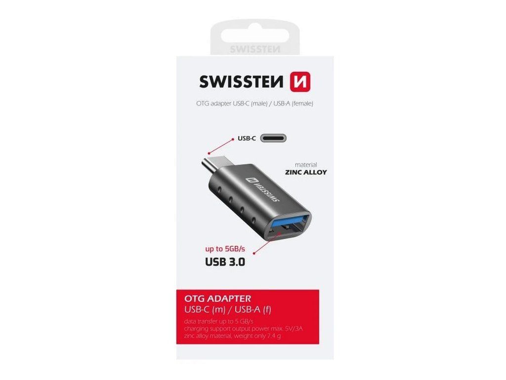SWISSTEN OTG adaptér USB 3.0 na USB-CMiniaturní OTG adaptér umožňuje připojit zařízení s konektorem USB 3.0 do USB-C. Podporuje datové přenosy až do rychlosti 5 Gb/s. V případě nabíjení podporuje nabíjecí proud až 3 A a napětí až 5 V. Kryt adaptéru je vyroben z odolného materiálu na bázi zinku.