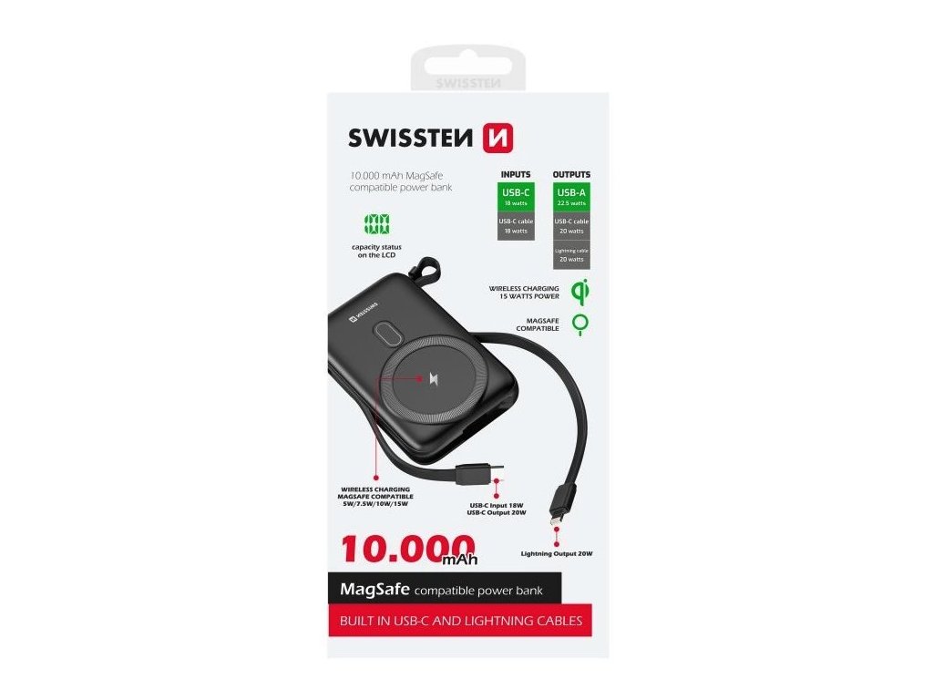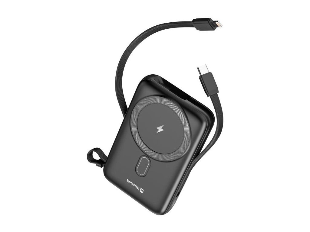 SWISSTEN powerbanka s MagSafe a kabely USB-C/Lightning 10000 mAhPowerbanka s kapacitou 10 000 mAh, se kterou již nebudete muset řešit žádné kabely. Nabízí dva integrované kabely s konektory USB-C a Lightning, a navíc i bezdrátové dobíjení pomocí technologie Qi či MagSafe. Powerbanka disponuje menšími rozměry (113 × 72 × 22 mm), tudíž nezabere velké množství místa a s váhou 225 g ji můžete nosit v tašce nebo kabelce.