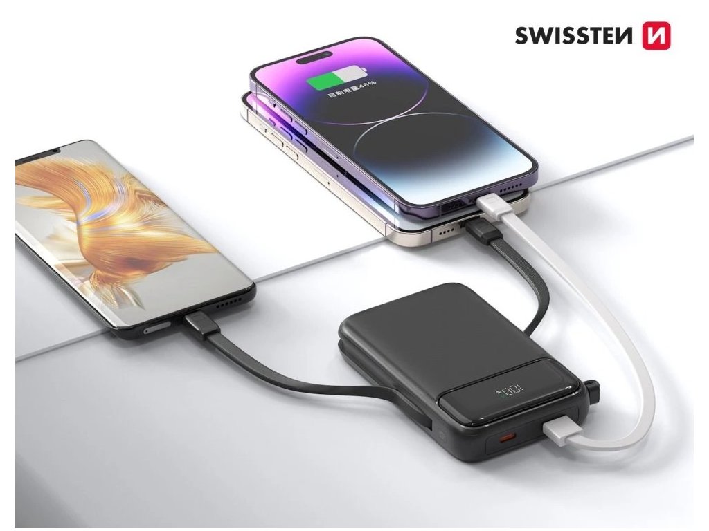 Swissten power bank 10000 mah pd 20w s integrovanými kabely usb-c a lightning (kompatibilní s magsafe)