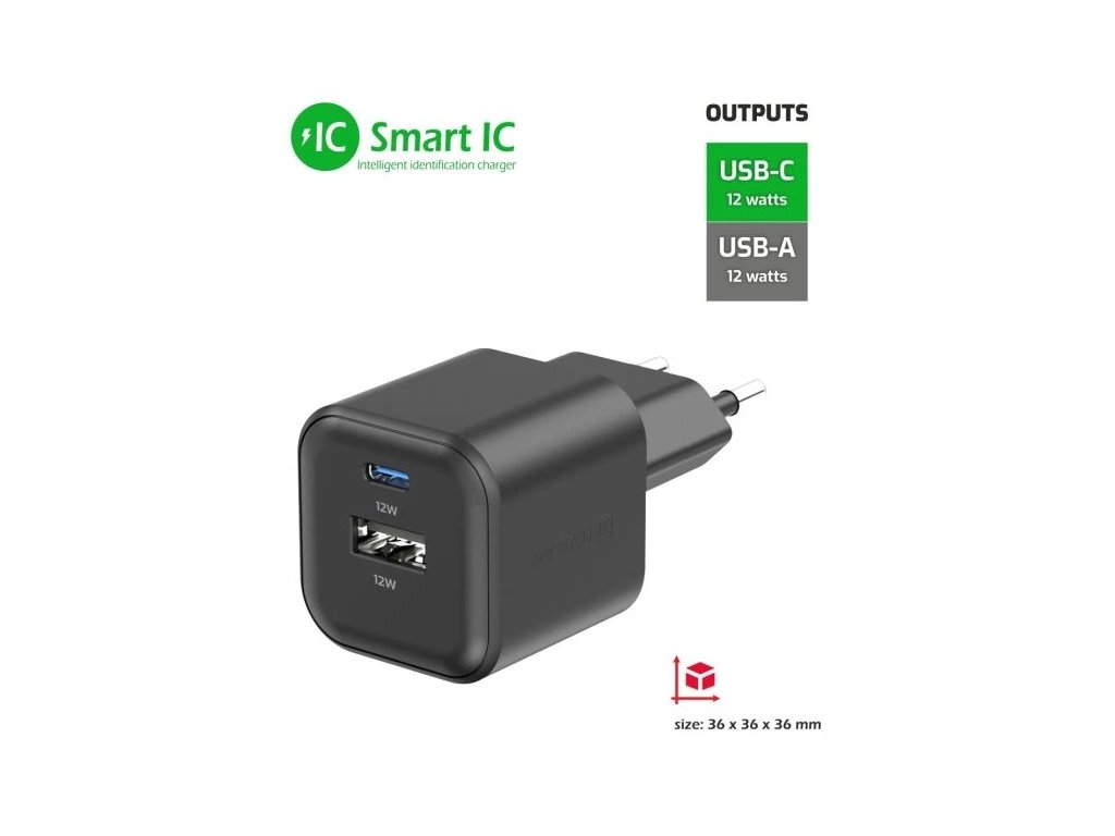 SWISSTEN 1× USB-C + 1× USB 12 WUniverzální napájecí adaptér s výkonem až 12 W. Pro nabíjení zařízení je k dispozici jeden konektor USB-C a jeden konektor USB. Použitý protokol SMART IC zajistí identifikaci a ochranu vašeho zařízení. Samozřejmostí je ochrana proti zkratování, přepětí, přetížení nabíjení a vysoké teplotě.