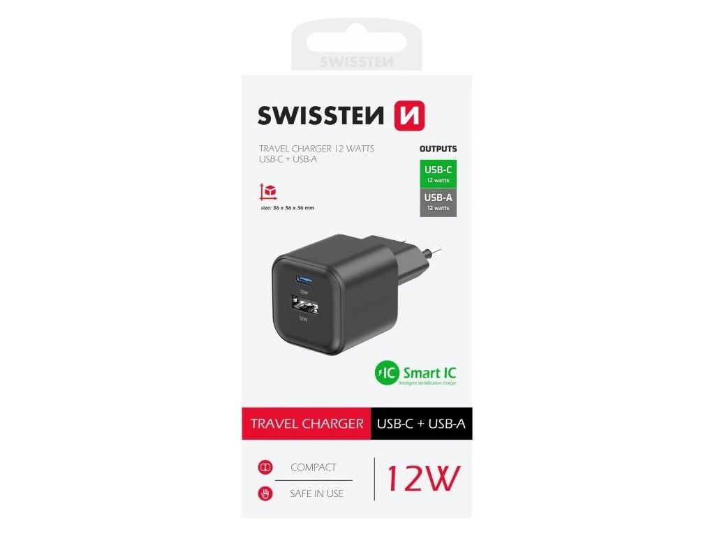 Swissten síťový adaptér 12w 1x usb-c + 1x usb-a černý