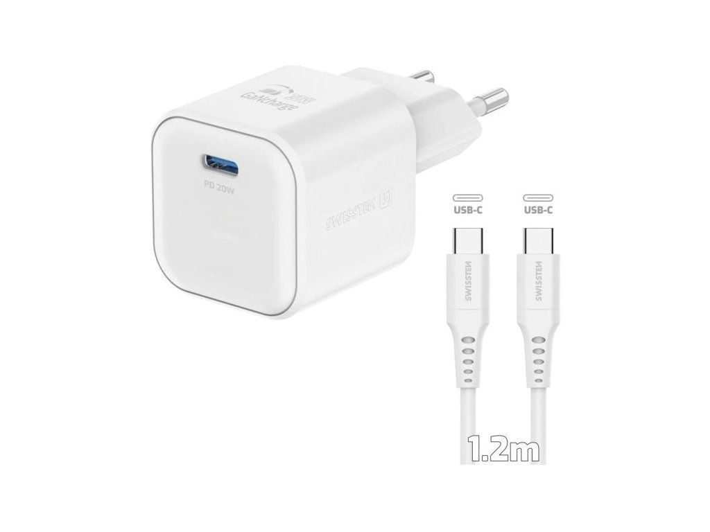 Swissten síťový adaptér gan 1x usb-c 20w power delivery bílý + datový kabel usb-c/usb-c 1,2 m bílý
